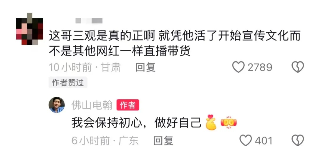 评论区,不少网友对“佛山电翰”的选择表示支持和夸赞,“能说出不消费工人这个身份这句话有多少人能做到?”“三观真的正,就凭他火了开始宣传文化。”